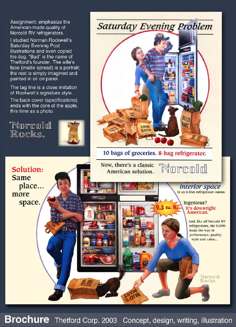 Before I learned that Fine Artists were supposed to sneer at mere “commercial” art, I considered design, especially architecture, every bit as worthy. Some of my favorite painters were illustrators like N.C. Wyeth and Norman Rockwell (see “Saturday Evening Problem” below). Or designers like da Vinci. I gladly accepted commercial art jobs in high school and college. My happiest paid workdays were spent on restaurant and tourist mall designs.