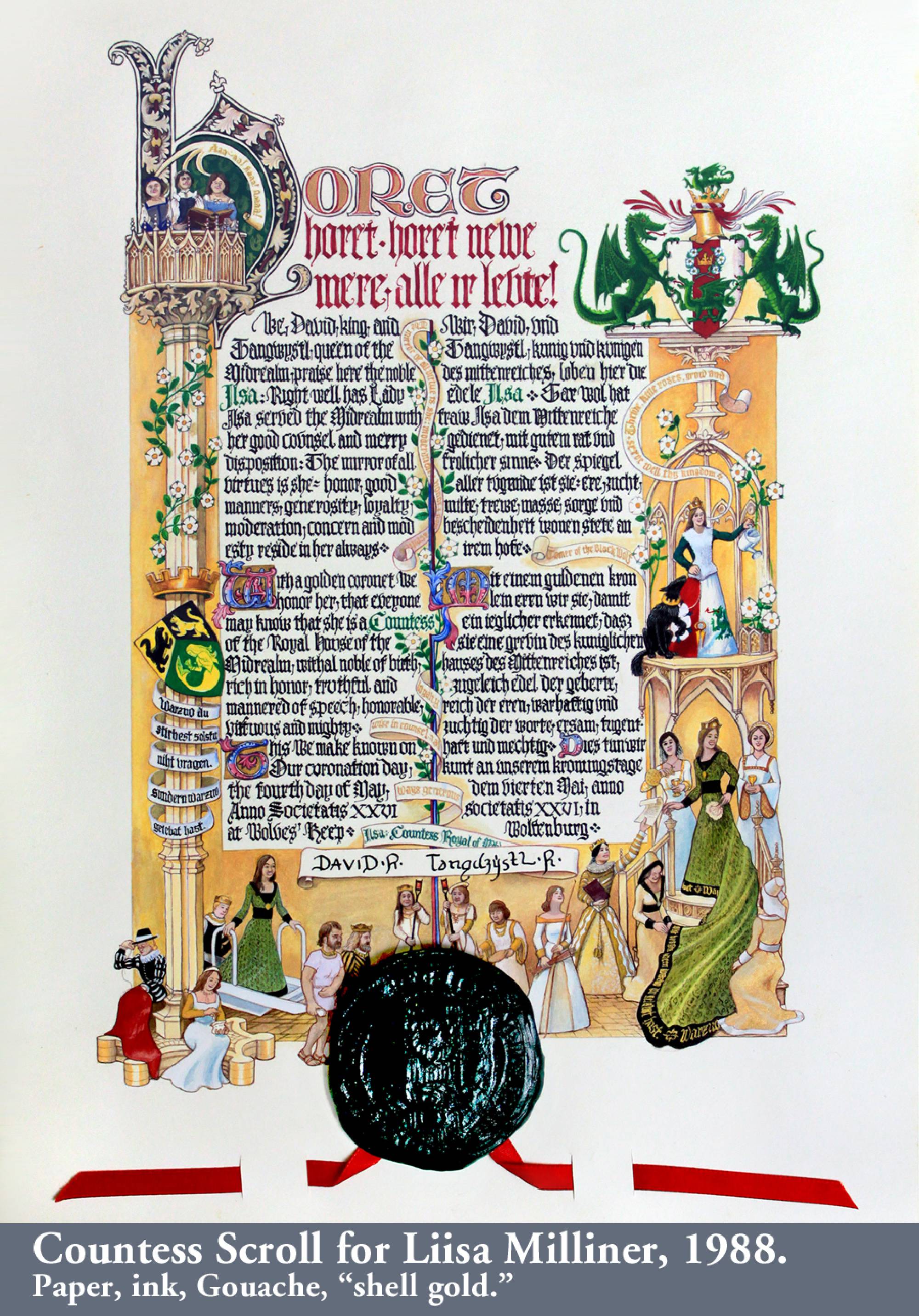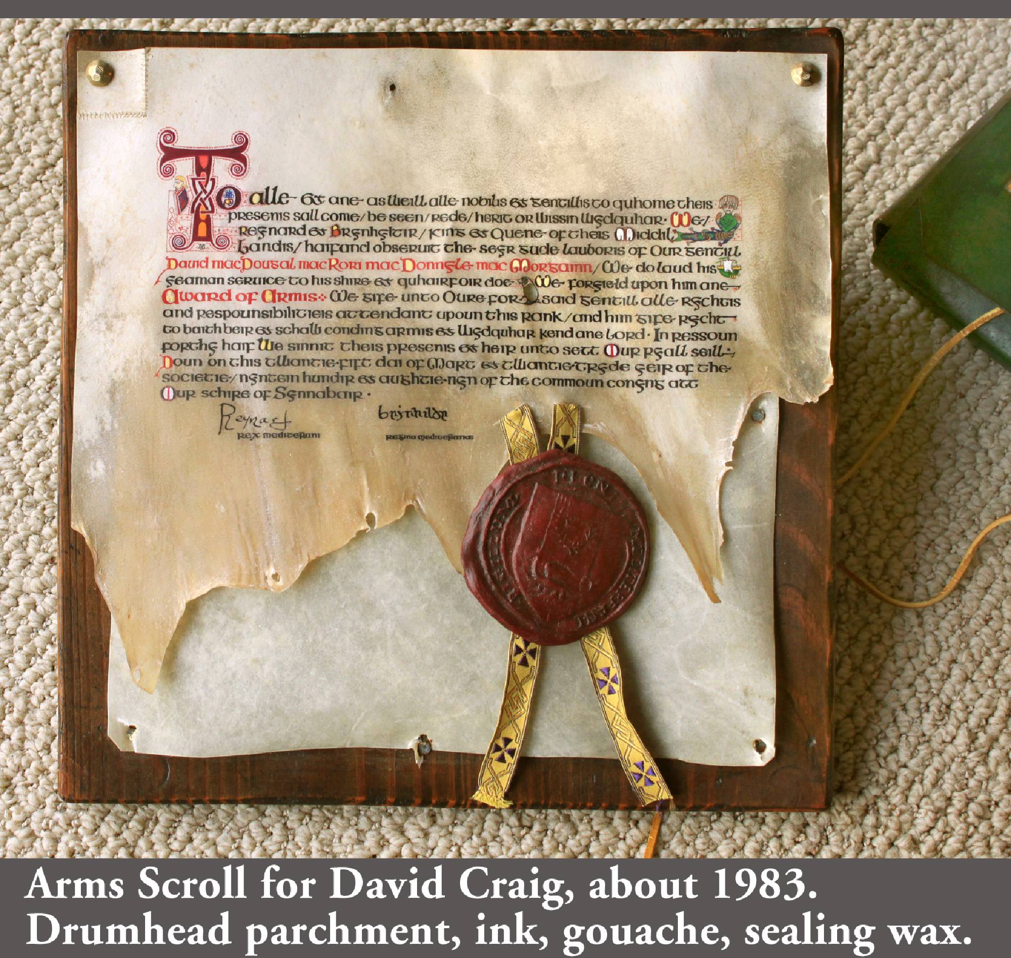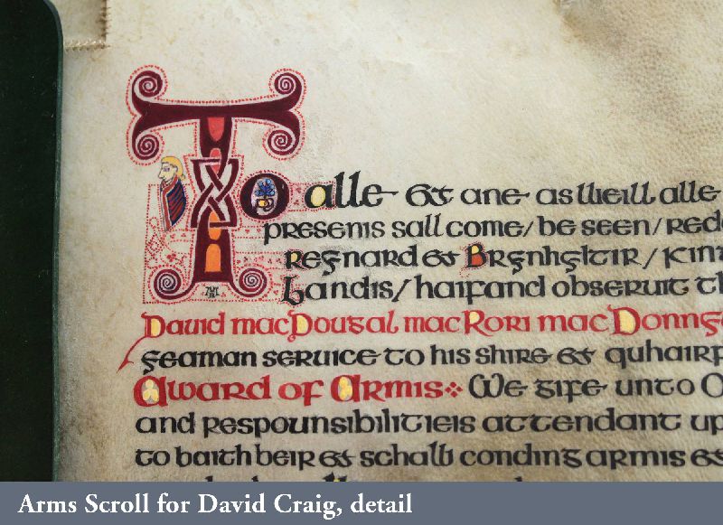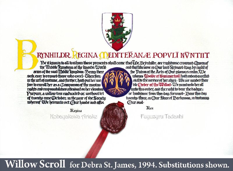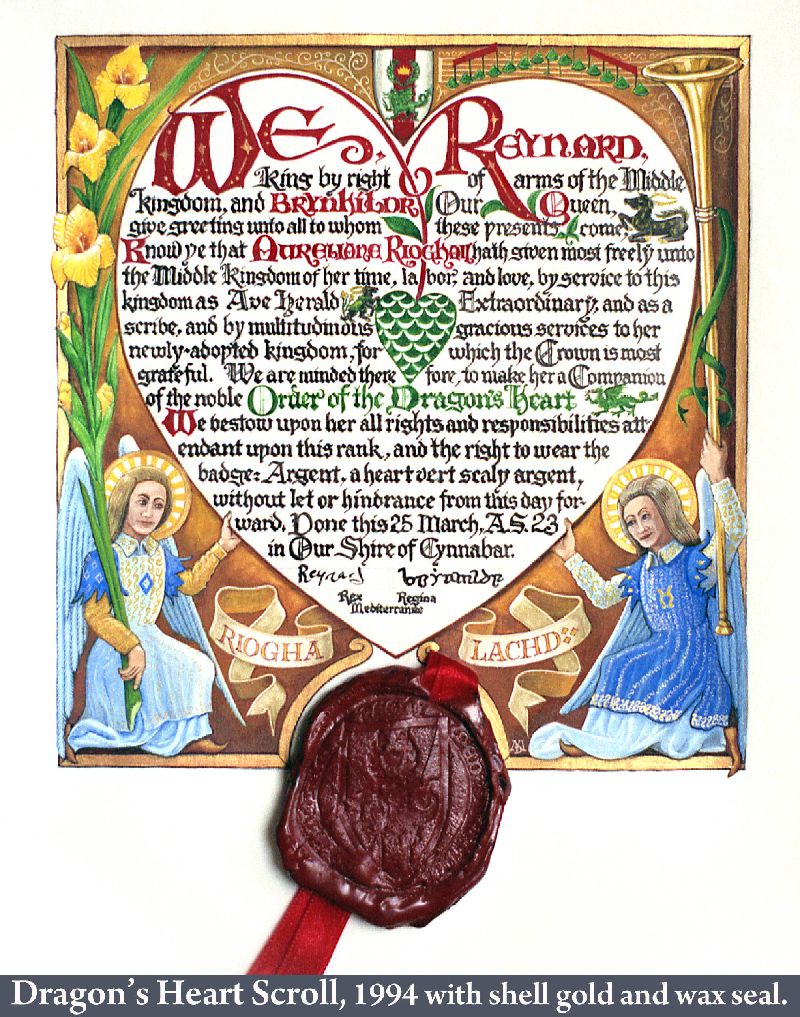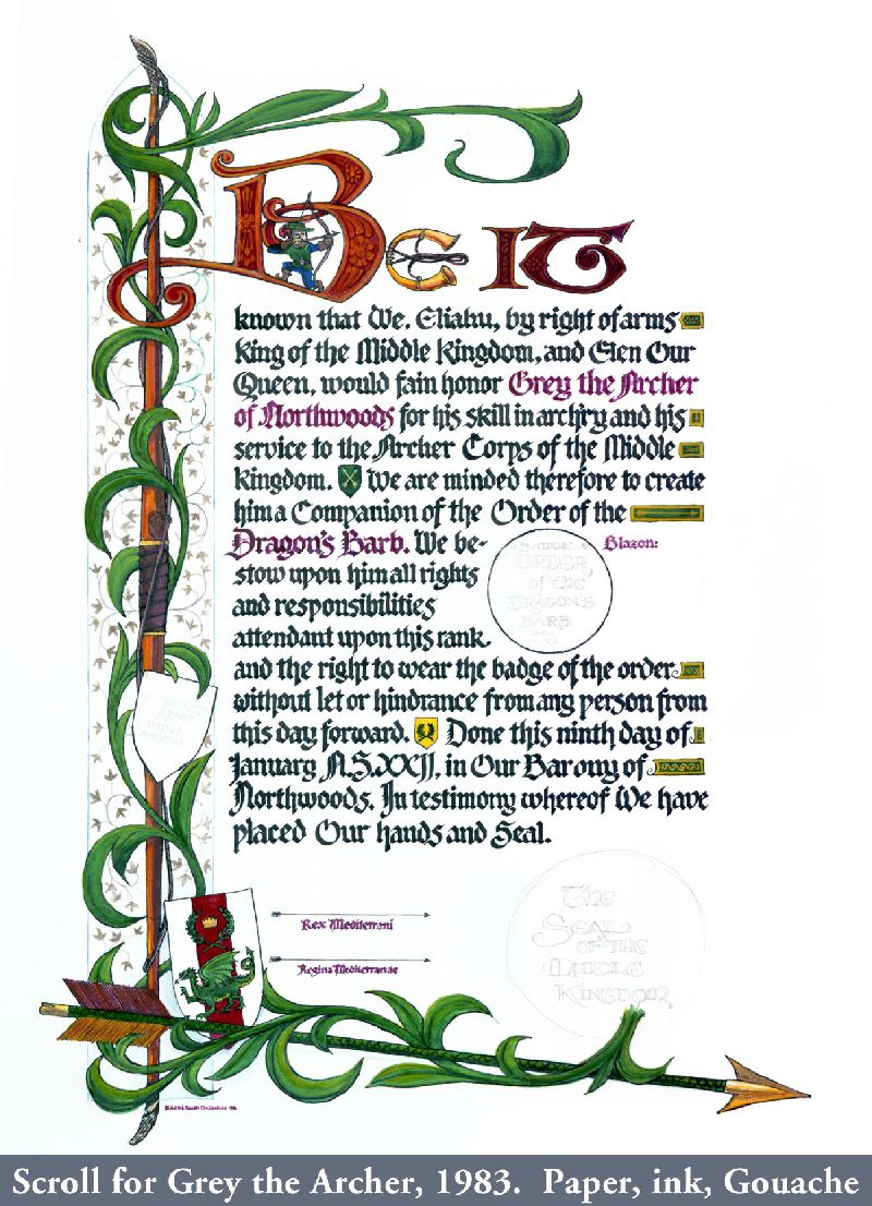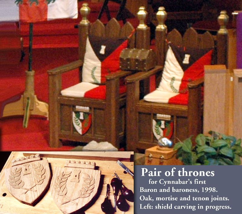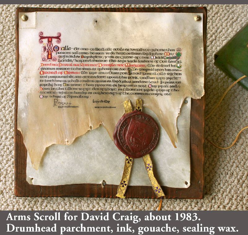 In the Society for Creative Anachronism (SCA) making award scrolls for other members is a whole hobby-within-a-hobby. So are armor making, woodworking, costuming, culinary arts, period music... it’s a long list. While most of my earlier SCA award scrolls, including the Dragon’s Heart and Countess scrolls, follow the SCA-traditional book-page style, the Arms scroll for David Craig, the Queen’s Favor and Willow are based on actual scrolls confirming charters and grants of the period. I received expert translations for the Celtic and Countess scrolls. But while top SCA scribes use real parchment and even grind their own pigments, I merely used gouache and, except for the Arms scroll, paper. On the plus side, I was fortunate to attend a Heraldic Painting workshop in England taught by former Queen’s Painter Anthony Wood, whose work commands princely sums. My Gorget, which I still use, is based on one in the Chicago Institute of Arts, but is not etched as that would have placed it outside my “persona” period. The thrones and the speaker cabinet roughly follow forms from period sources.