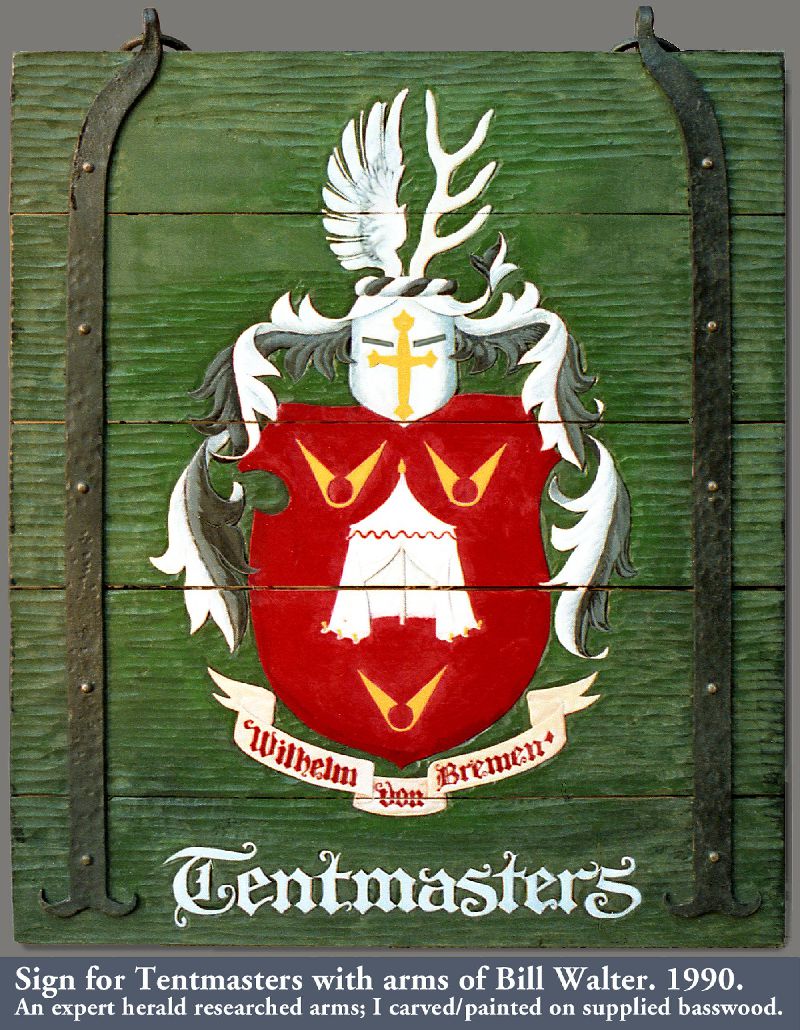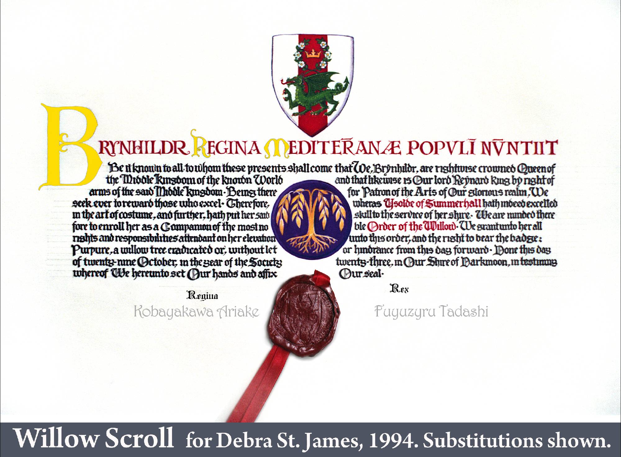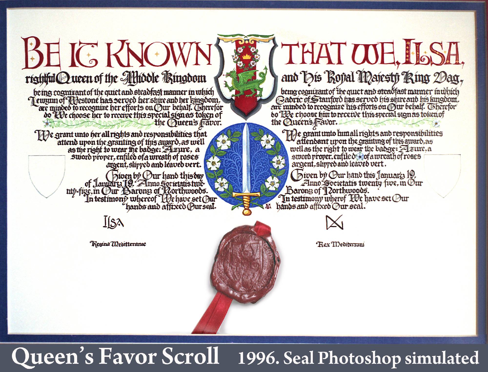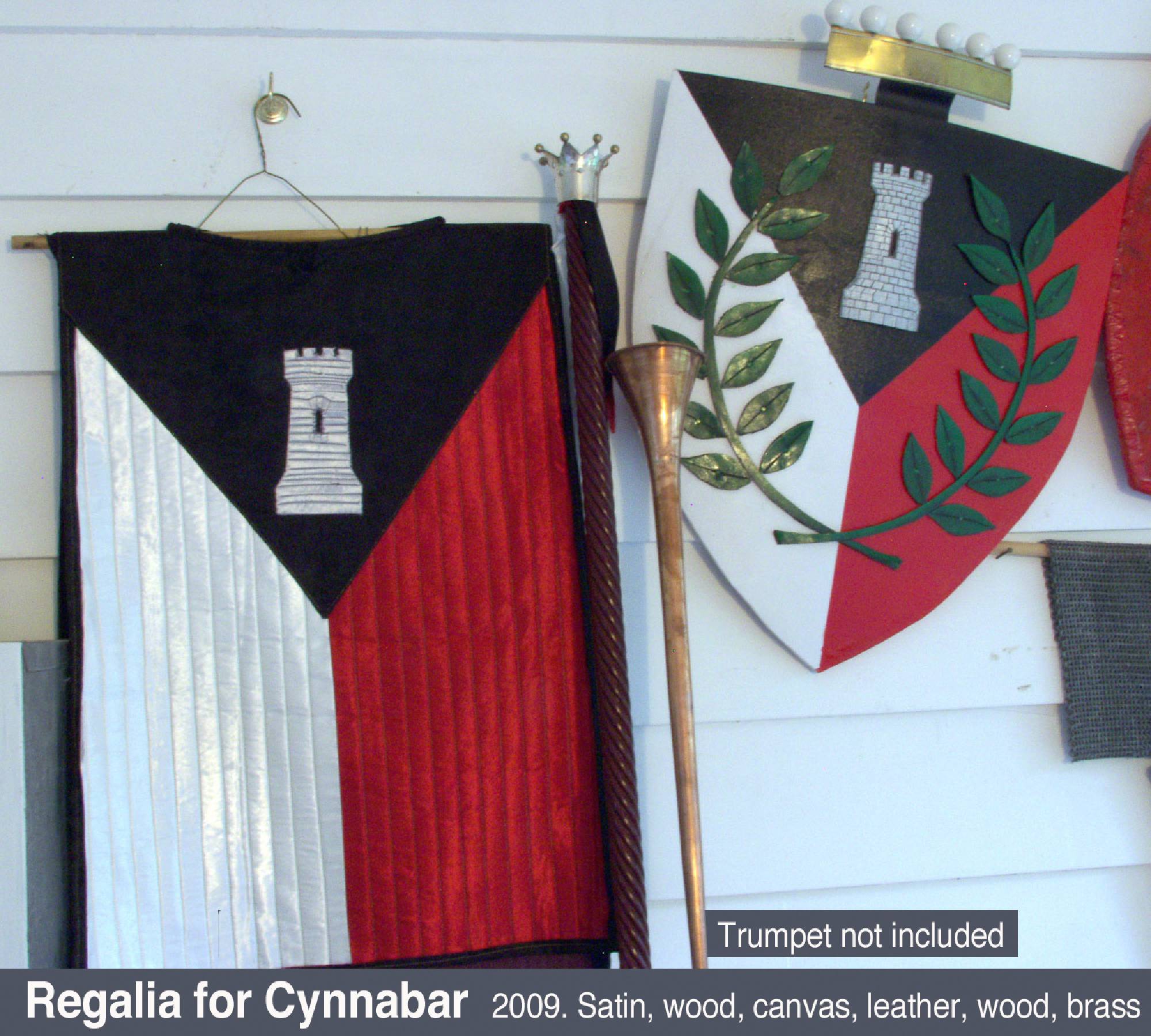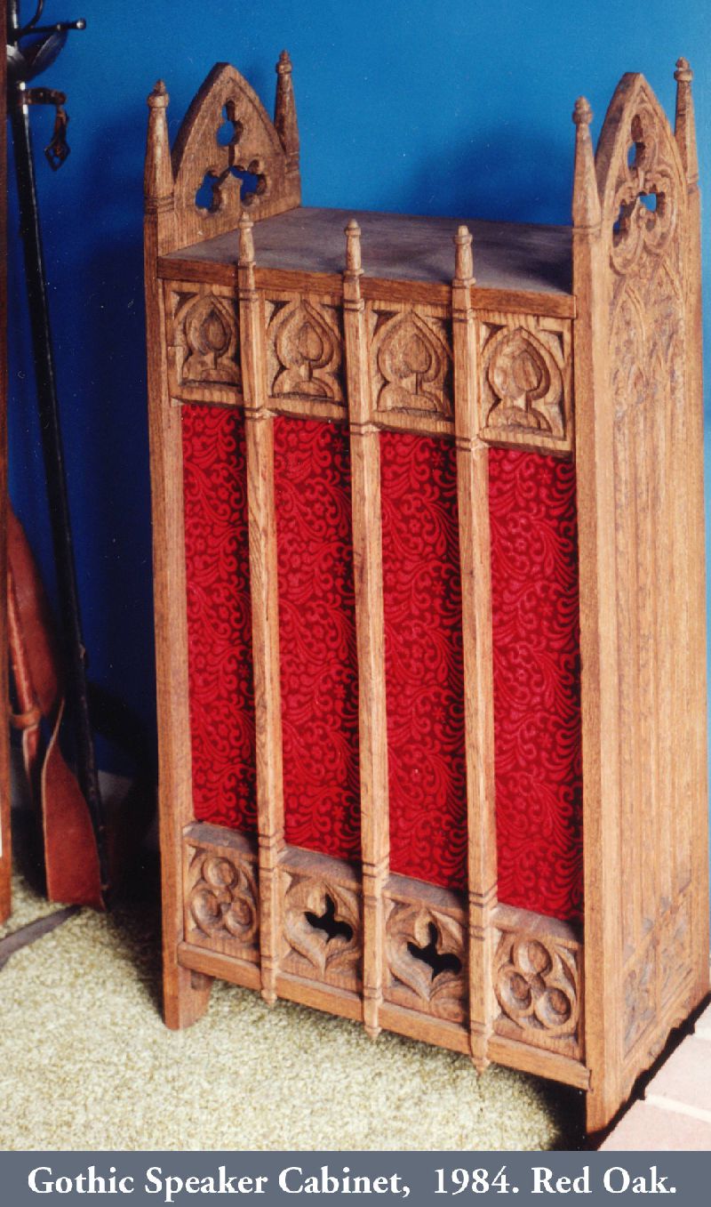 In the Society for Creative Anachronism (SCA) making award scrolls for other members is a whole hobby-within-a-hobby. So are armor making, woodworking, costuming, culinary arts, period music... it’s a long list. While most of my earlier SCA award scrolls, including the Dragon’s Heart and Countess scrolls, follow the SCA-traditional book-page style, the Arms scroll for David Craig, the Queen’s Favor and Willow are based on actual scrolls confirming charters and grants of the period. I received expert translations for the Celtic and Countess scrolls. But while top SCA scribes use real parchment and even grind their own pigments, I merely used gouache and, except for the Arms scroll, paper. On the plus side, I was fortunate to attend a Heraldic Painting workshop in England taught by former Queen’s Painter Anthony Wood, whose work commands princely sums. My Gorget, which I still use, is based on one in the Chicago Institute of Arts, but is not etched as that would have placed it outside my “persona” period. The thrones and the speaker cabinet roughly follow forms from period sources.