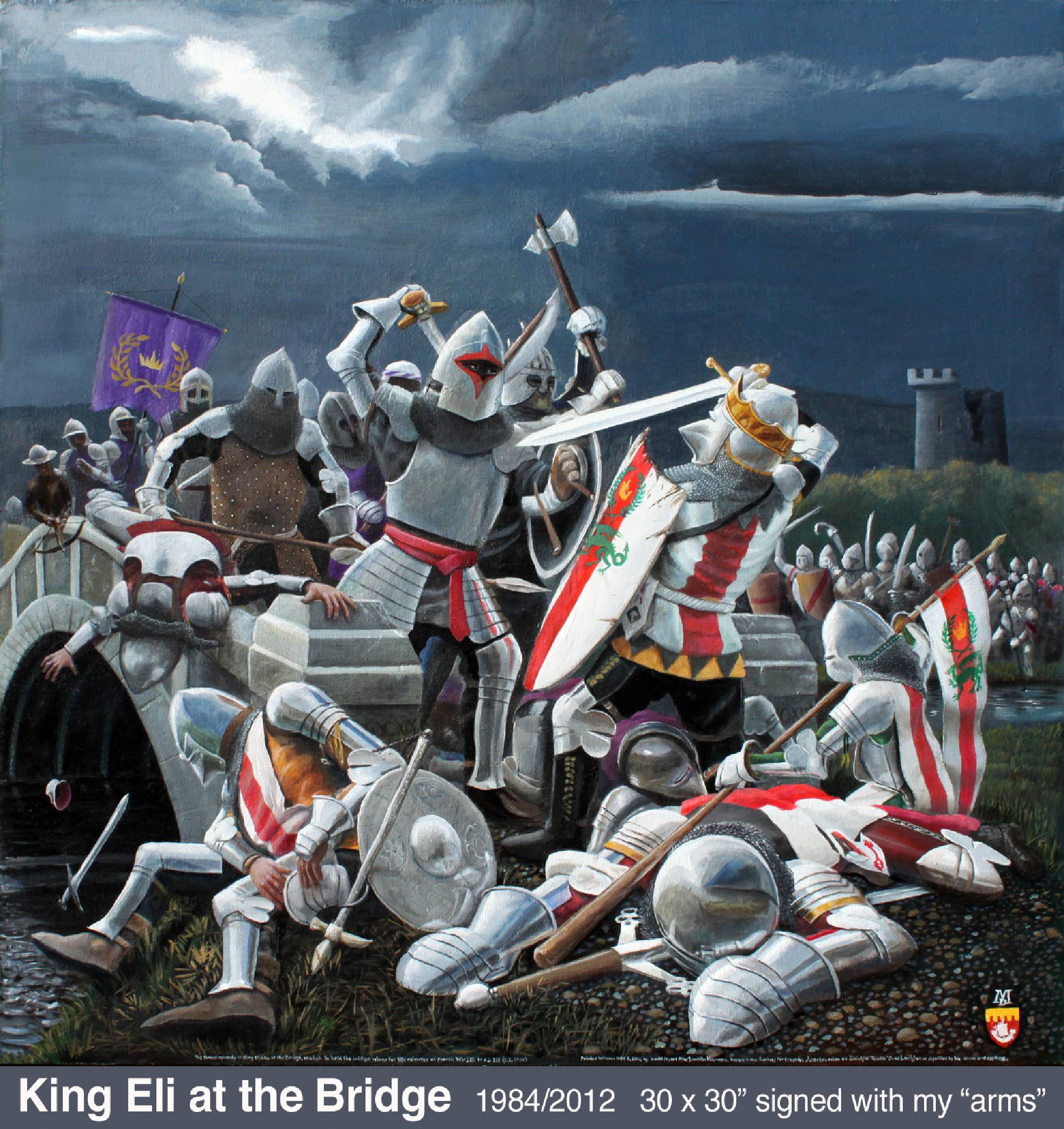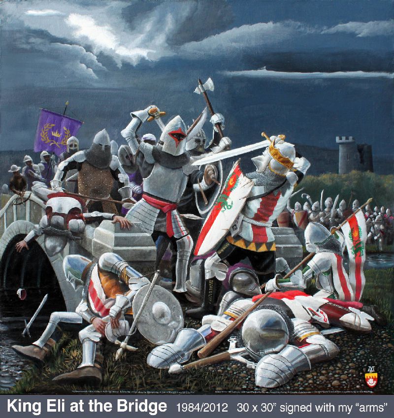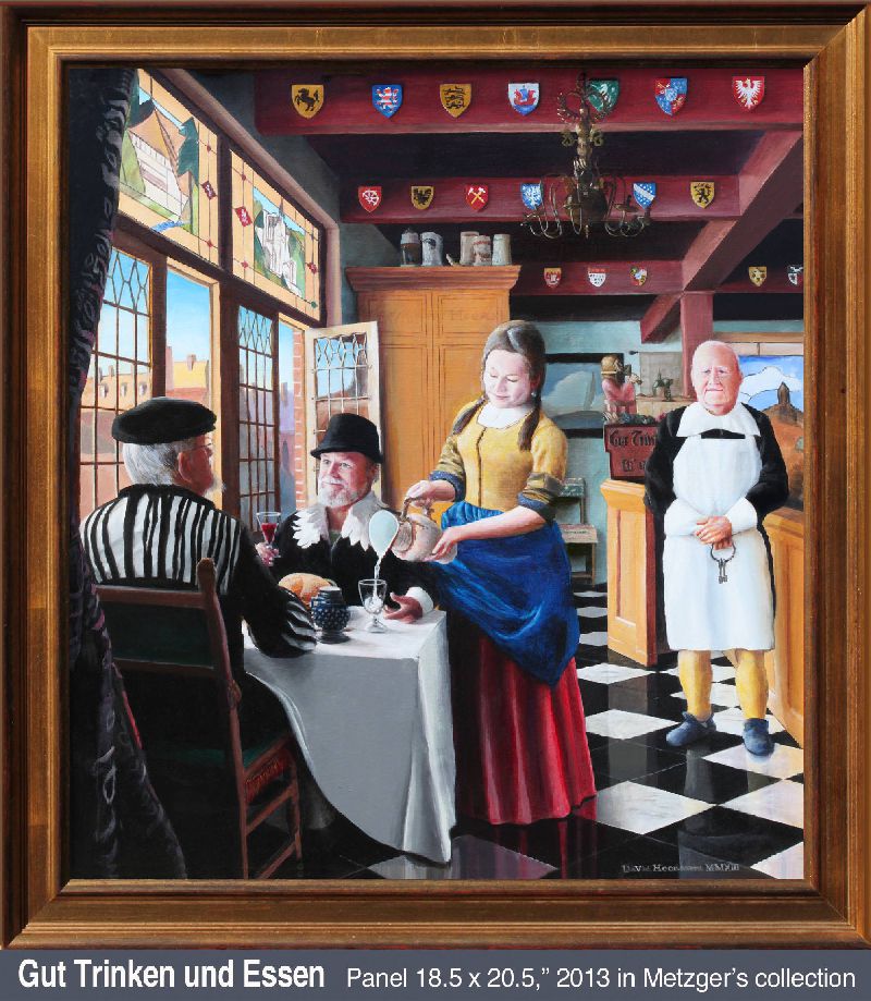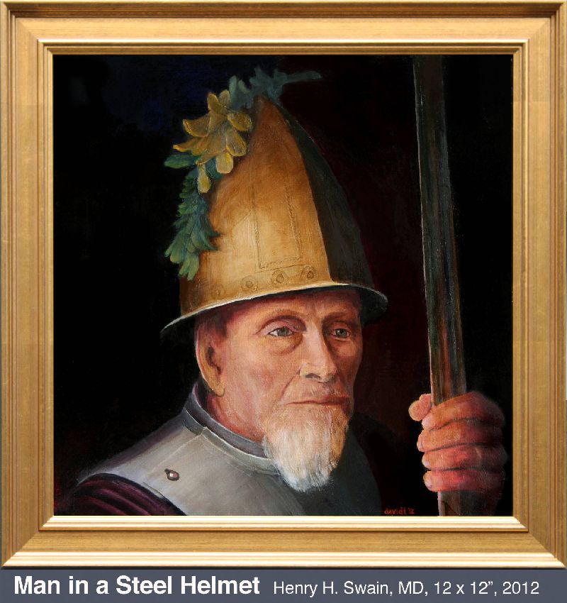 I’m not a portrait specialist, but have always believed it’s one of the things complete painters do. Photos were essential references for all of those shown. My fencing master, who gave me so many valuable life lessons, inspired my first attempt. Dr. Henry H. (“Hank”) Swain became my art patron in 2010 when I did Magura Woman from a photo taken by his wife Vicki. Later he agreed to sit for my version of Rembrandt’s Man in a Golden Helmet, a painting I have always admired. He is wearing a steel gorget I made for my own use (click for photo). One of Hank’s favorite stories was of Von Meegeren’s Vermeer forgeries. Lunching atMetzger’s in Ann Arbor, we noticed the stained-glass window light looked rather Vermeer-like. And that our server Lisa would make a nicer “Milkmaid” than the model Vermeer portrayed. The result was my own Vermeer send-up, Gut Trinken und Essen. For the complete storyclick here. King Eli features a friend of many years, the hero of a 1984 SCA Pennsic War battle. I am depicted prone in right foreground. To view enlarged poster with the story of the battle and the painting, click here. I carefully photographed the Young Man in his favourite meditation spot with elements of his own avocations.