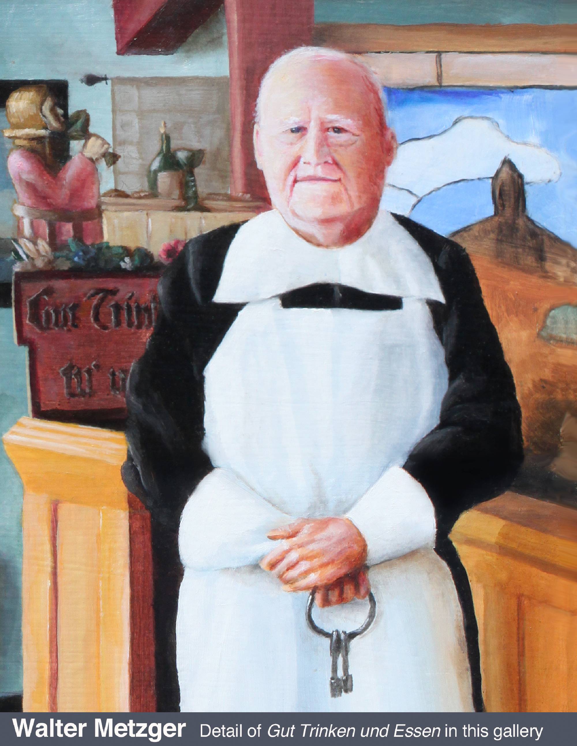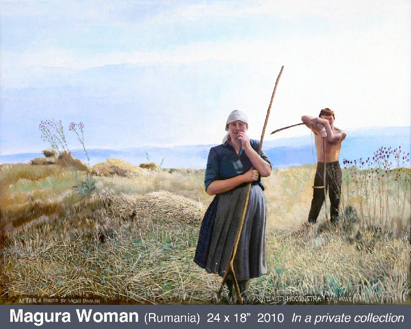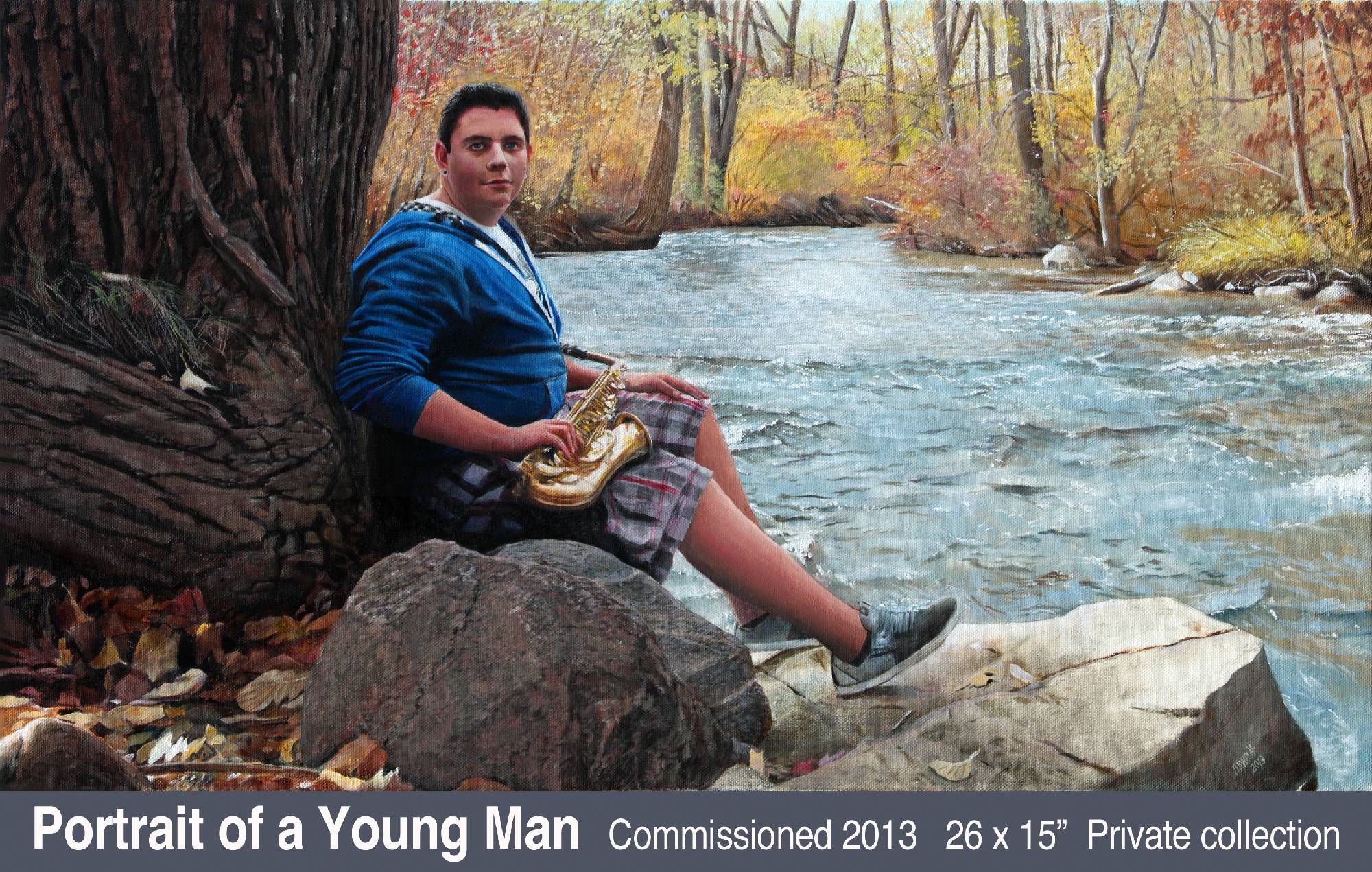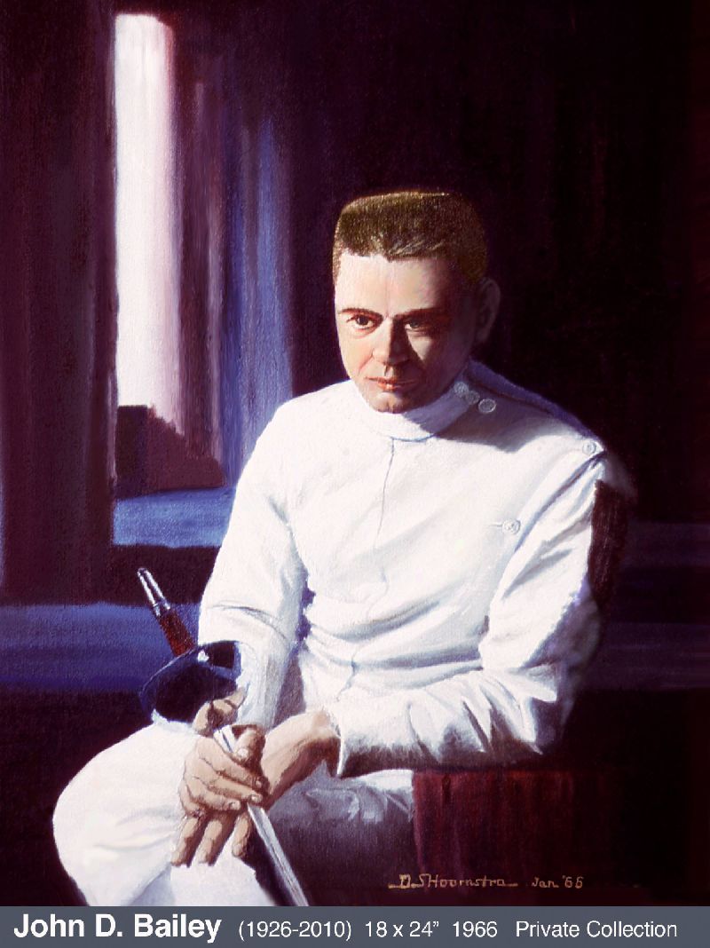 I’m not a portrait specialist, but have always believed it’s one of the things complete painters do. Photos were essential references for all of those shown. My fencing master, who gave me so many valuable life lessons, inspired my first attempt. Dr. Henry H. (“Hank”) Swain became my art patron in 2010 when I did Magura Woman from a photo taken by his wife Vicki. Later he agreed to sit for my version of Rembrandt’s Man in a Golden Helmet, a painting I have always admired. He is wearing a steel gorget I made for my own use (click for photo). One of Hank’s favorite stories was of Von Meegeren’s Vermeer forgeries. Lunching atMetzger’s in Ann Arbor, we noticed the stained-glass window light looked rather Vermeer-like. And that our server Lisa would make a nicer “Milkmaid” than the model Vermeer portrayed. The result was my own Vermeer send-up, Gut Trinken und Essen. For the complete storyclick here. King Eli features a friend of many years, the hero of a 1984 SCA Pennsic War battle. I am depicted prone in right foreground. To view enlarged poster with the story of the battle and the painting, click here. I carefully photographed the Young Man in his favourite meditation spot with elements of his own avocations.