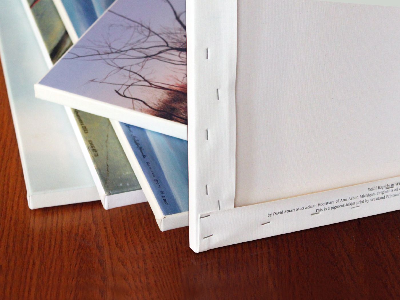 If for whatever reason you cannot own the original, a reproduction is a good choice. “Reproduction” implies matching the original as closely as can reasonably be done.* My printers use “Giclée” technology to print in high resolution directly on real canvas, with a no-fade life well over a century. At a glance, with a coat of varnish, these reproductions can be mistaken for an original. To prevent misunderstanding, I have the data printed along with the image so it shows on the back as shown here.